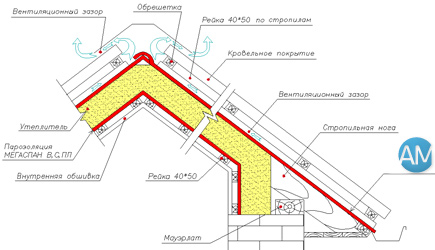 «Мегаспан АМ» укладывается в натянутом положении по стропилам непосредственно на утеплитель без зазора, белой стороной к утеплителю голубой к кровельному покрытию. Мембрану дополнительно закрепляем строительным степлером к стропилам. Нижняя кромка мембраны должна обеспечивать естественное стекание излишней влаги (если таковая появилась) с мембраны в водосточную систему. Поверх мембраны к стропилам саморезами монтируем контррейки (3*4, 4*5 см), которые обеспечивают вентиляционный зазор между мембраной и кровельным покрытием. По контррейкам монтируем обрешетку, на которую впоследствии укладываем кровельное покрытие. Важно! В нижней части кровли и в районе конька обязательно необходимо предусмотреть вентиляционные отверстия (см. схему). Нельзя использовать мембрану в качестве временной кровли.