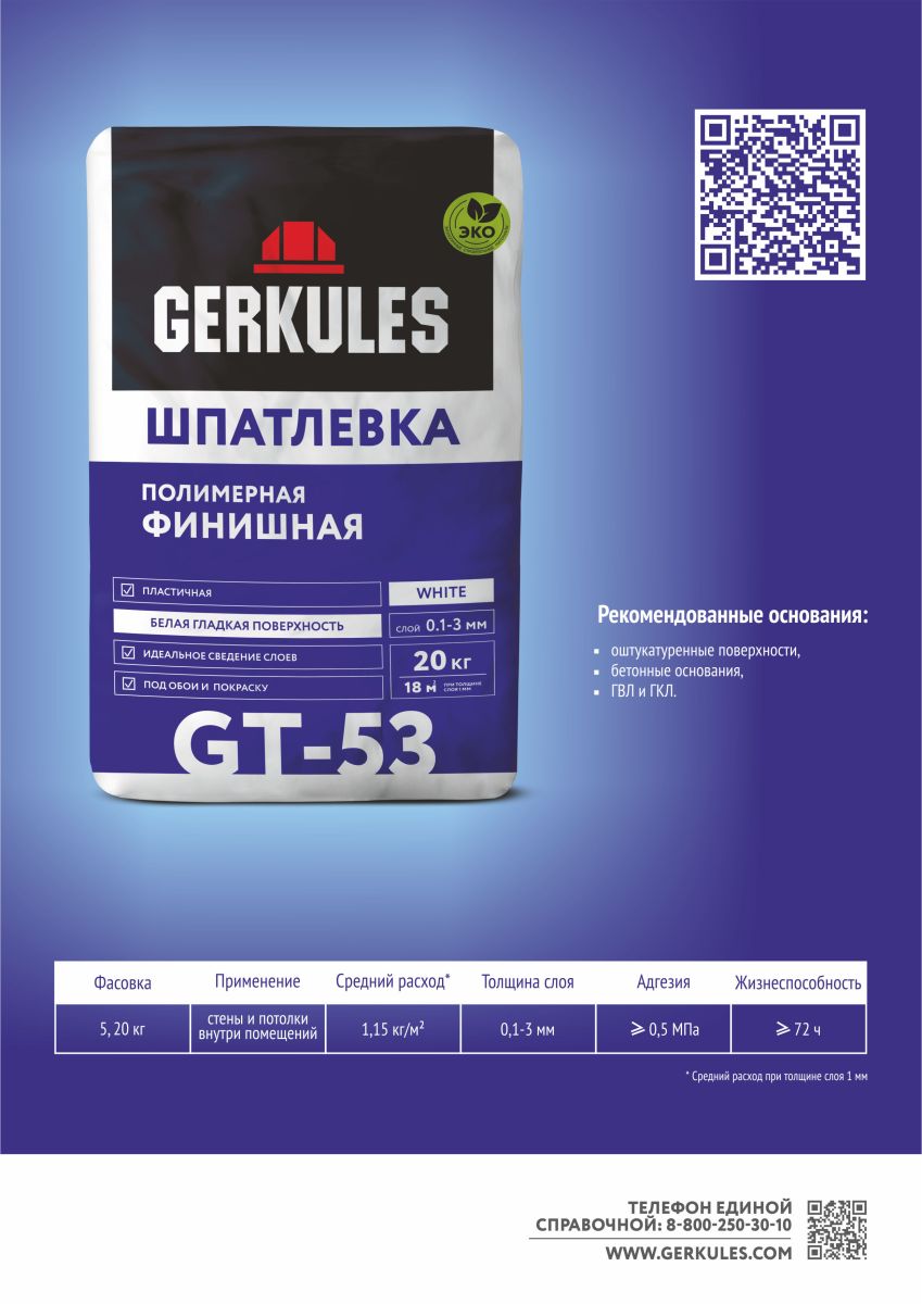 Шпатлевка полимерная Финишная Геркулес GT-53/20 кг