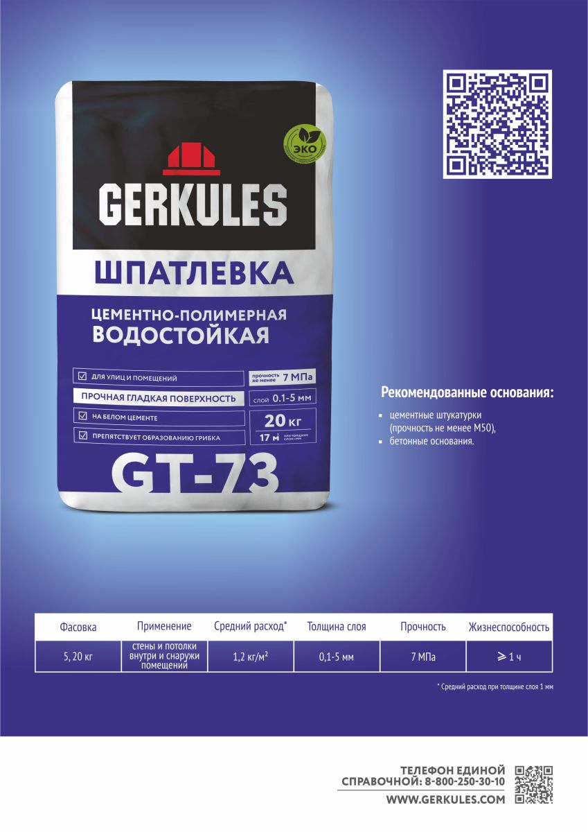 Шпатлевка цементно-полимерная Водостойкая Геркулес GT-73, 20 кг